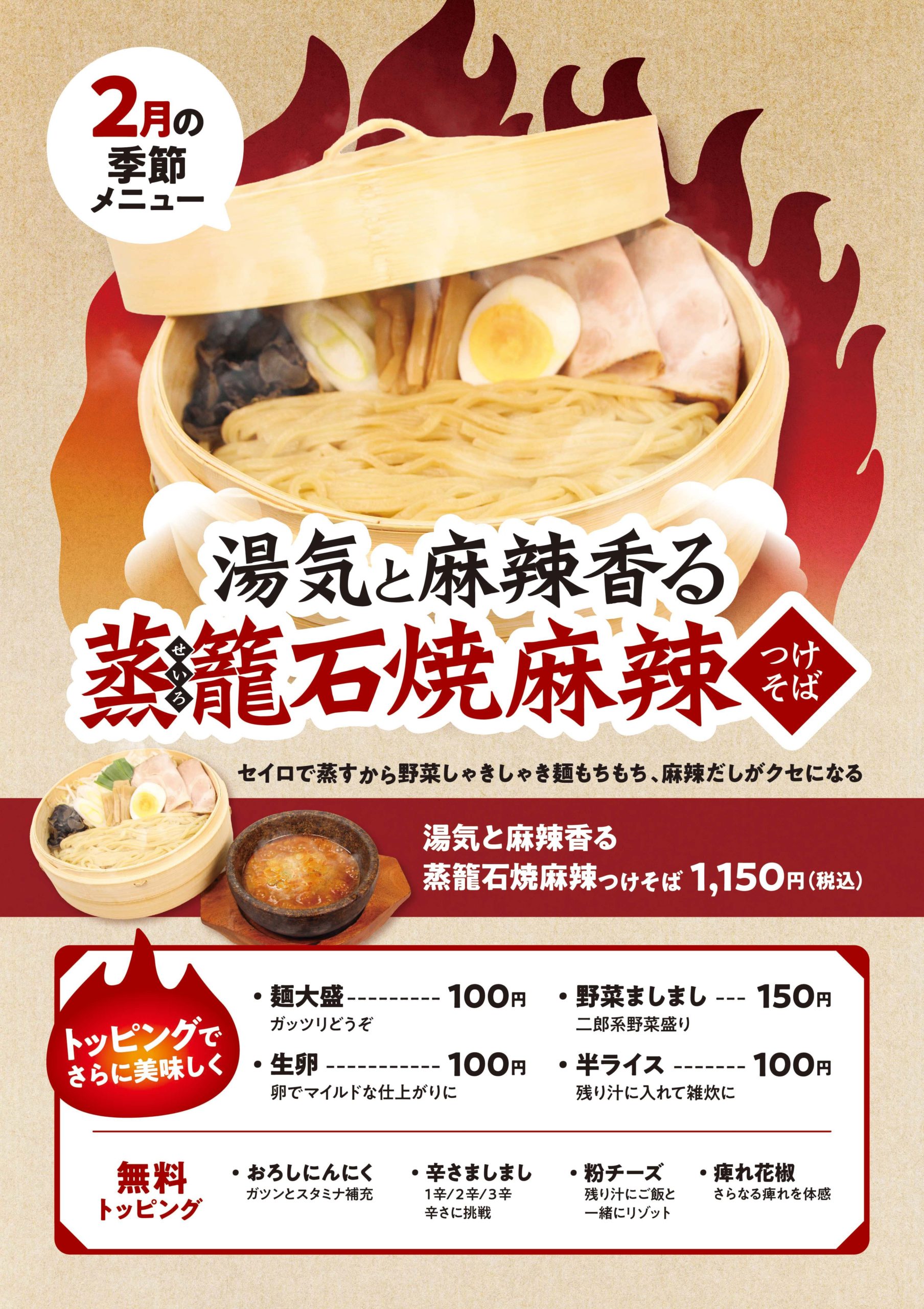 蒸籠で蒸しあげたホカホカの麺と具を石焼でアツアツの麻辣汁につけて寒い冬にぴったりな逸品です