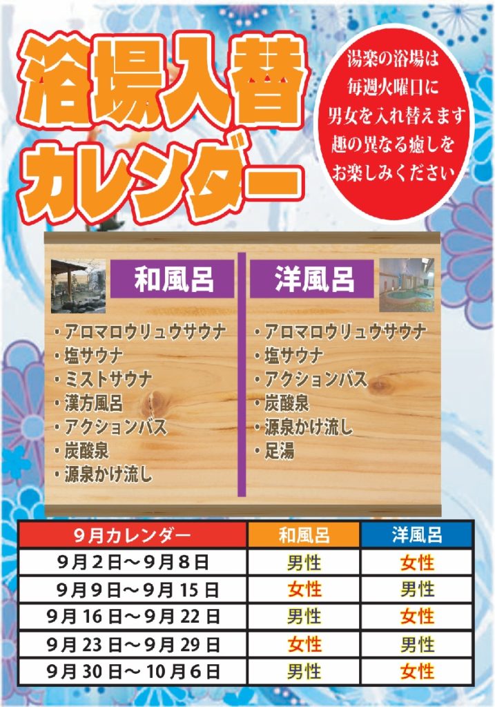 毎週火曜日は「和風呂」と「洋風呂」が男女入れ替わります
