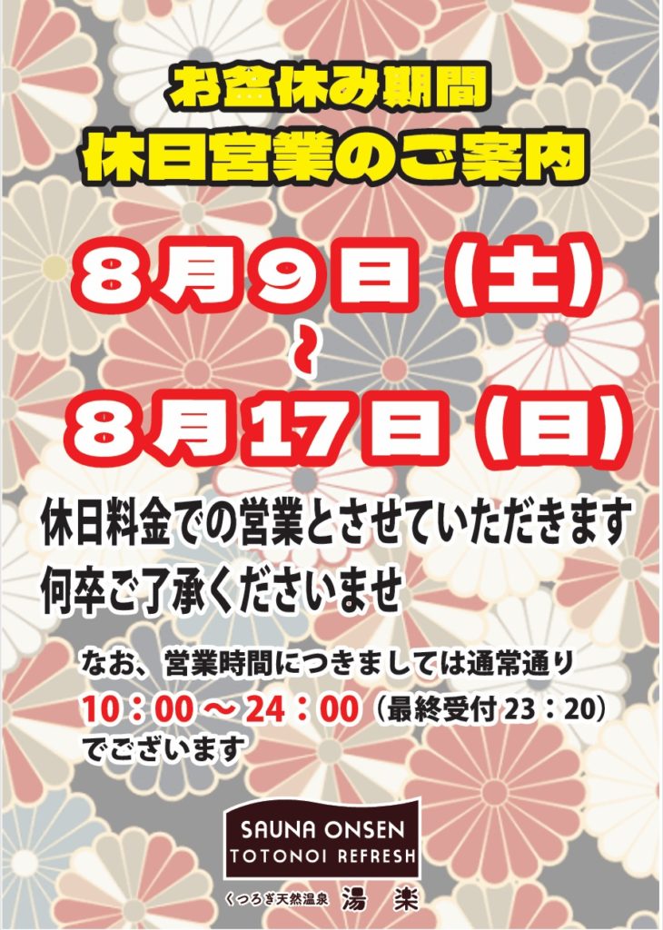 いつも湯楽をご利用いただき誠にありがとうございます。8月9日より8月17日の期間中は、お盆特別営業といたしまして、休日料金での営業とさせていただきます😊まだまだ暑い日が続きますが、涼しい館内を「津島の避暑地」として是非ご活用ください❤️🎉