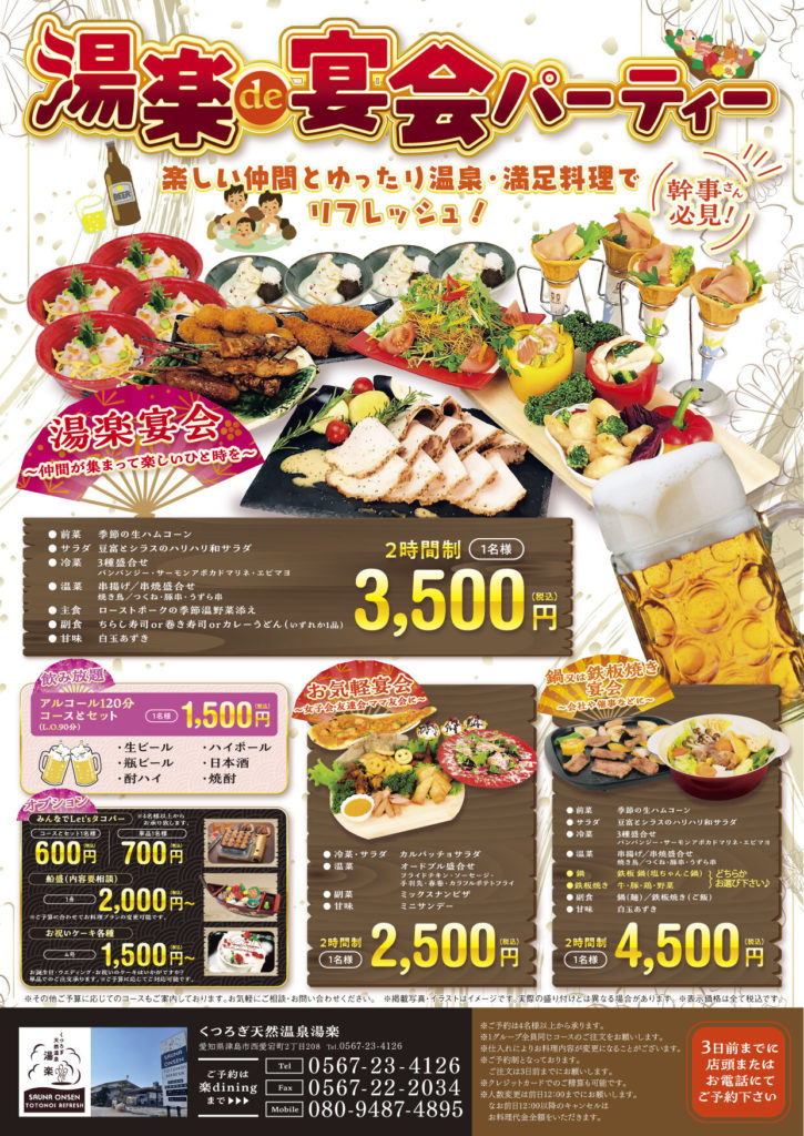 仲間同士や会社の集いなど日頃親しい友人と温泉に入って宴会はいかがですか?ご予算に応じてお料理をご提案させていただきます お気軽にお問い合わせください